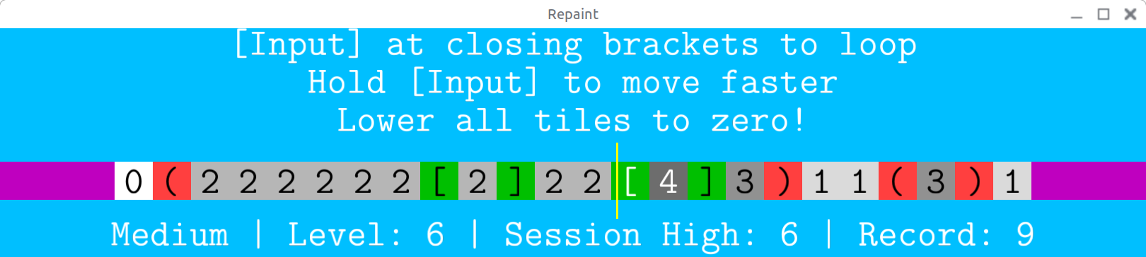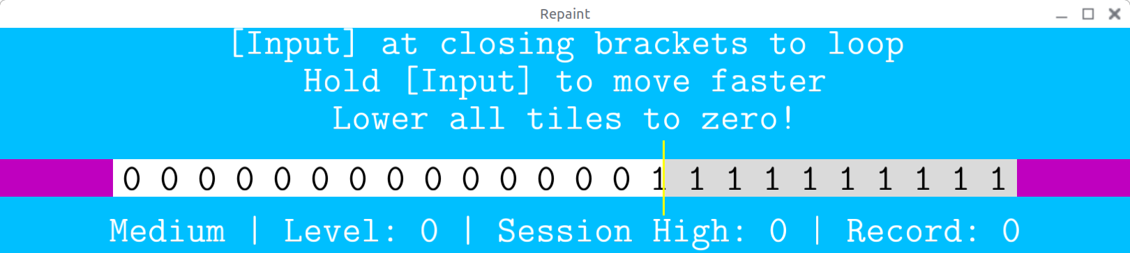 Get through the screens by painting all the tiles white with your automatically moving "paintbrush". The paintbrush is quite underpowered and needs to go over some tiles multiple times to fully paint them, so you need to use bracket blocks to loop over select regions. Make sure to jump back the correct number of times, in the correct places!